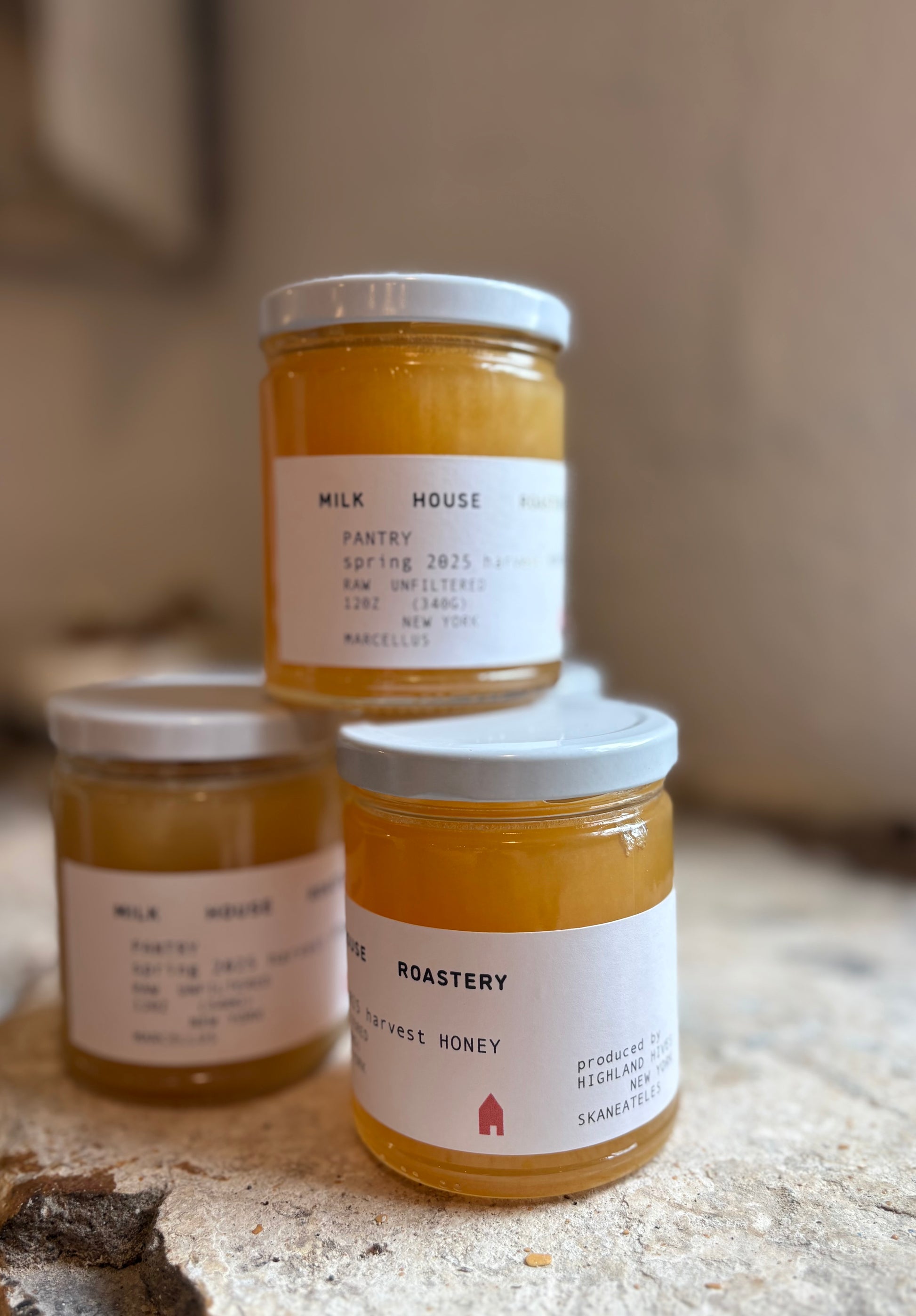 Raw, unfiltered honey. Produced by our neighbor Mary Pat Thompson at Highland Hives in Skaneateles, New York